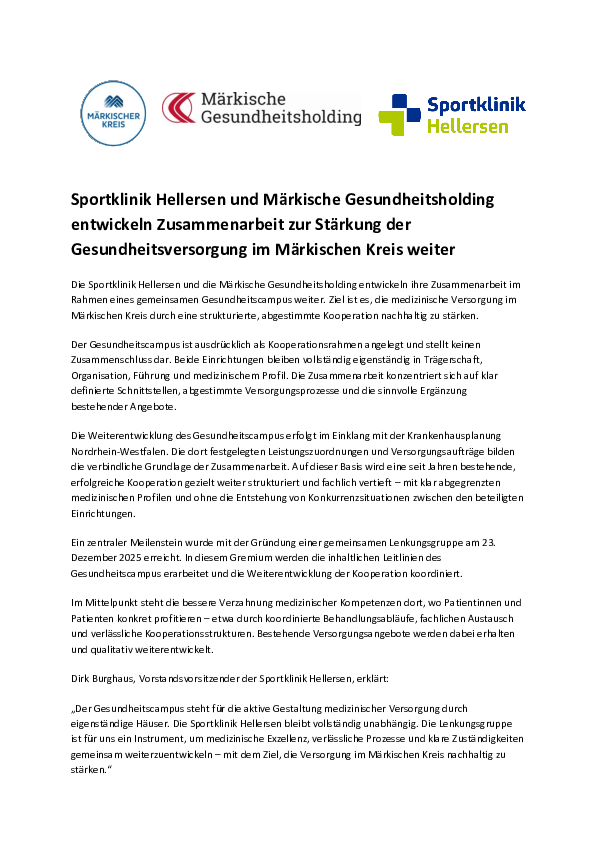 Die Sportklinik Hellersen und die Märkische Gesundheitsholding entwickeln ihre Zusammenarbeit im Rahmen eines gemeinsamen Gesundheitscampus weiter. Ziel ist es, die medizinische Versorgung im Märkischen Kreis durch eine strukturierte, abgestimmte Kooperation nachhaltig zu stärken.